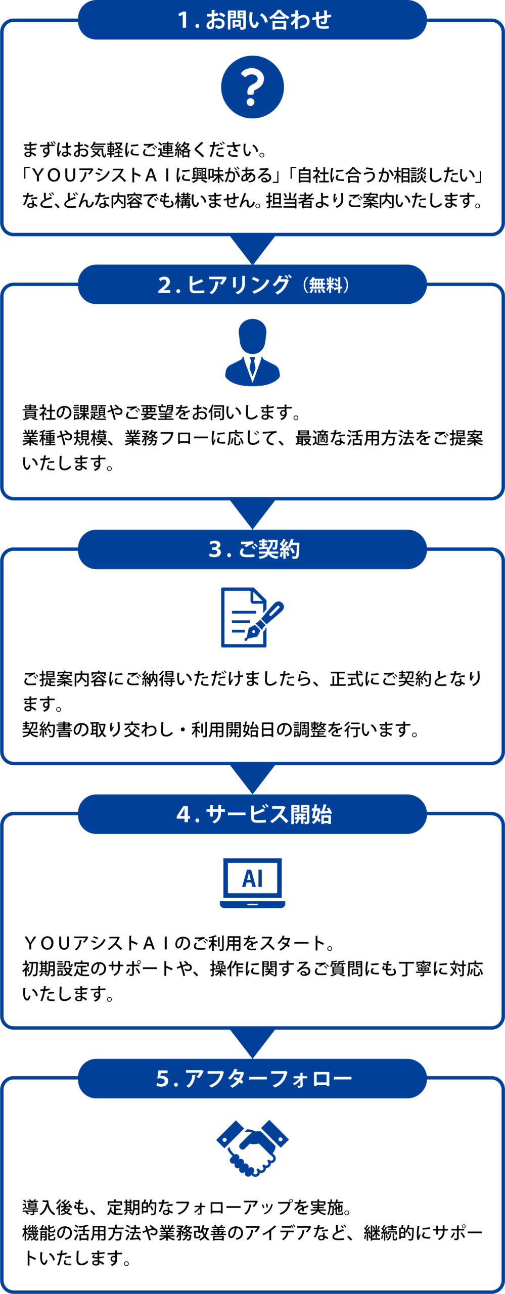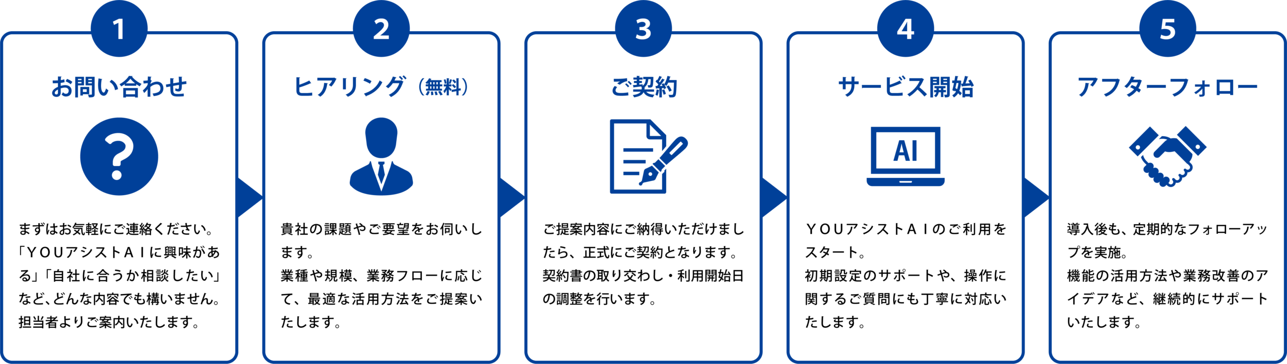 | サポート | YOUアシストAI以外のAIツールの サポートも可能、定例MTG、 学習データ収集・作成支援 |