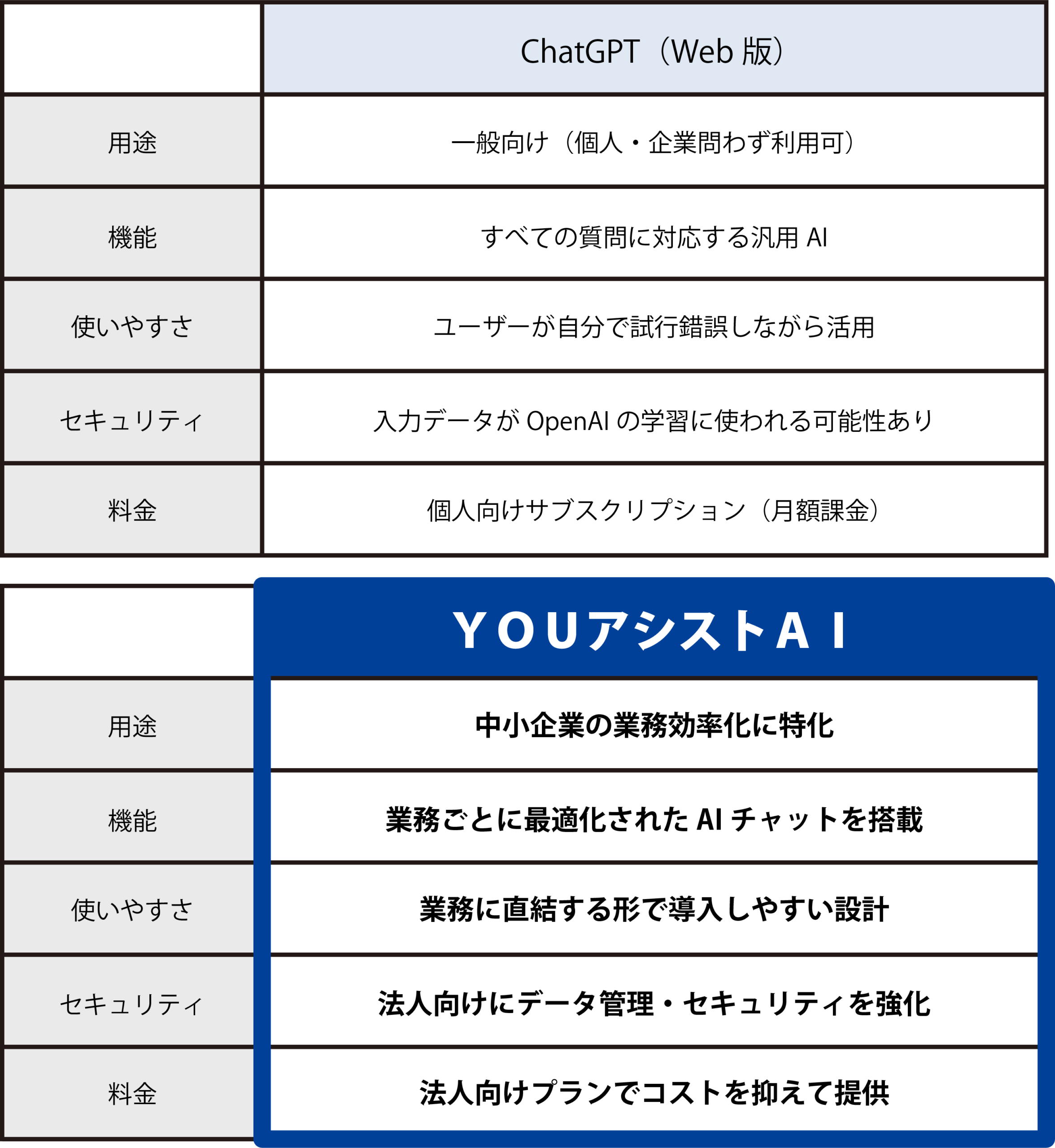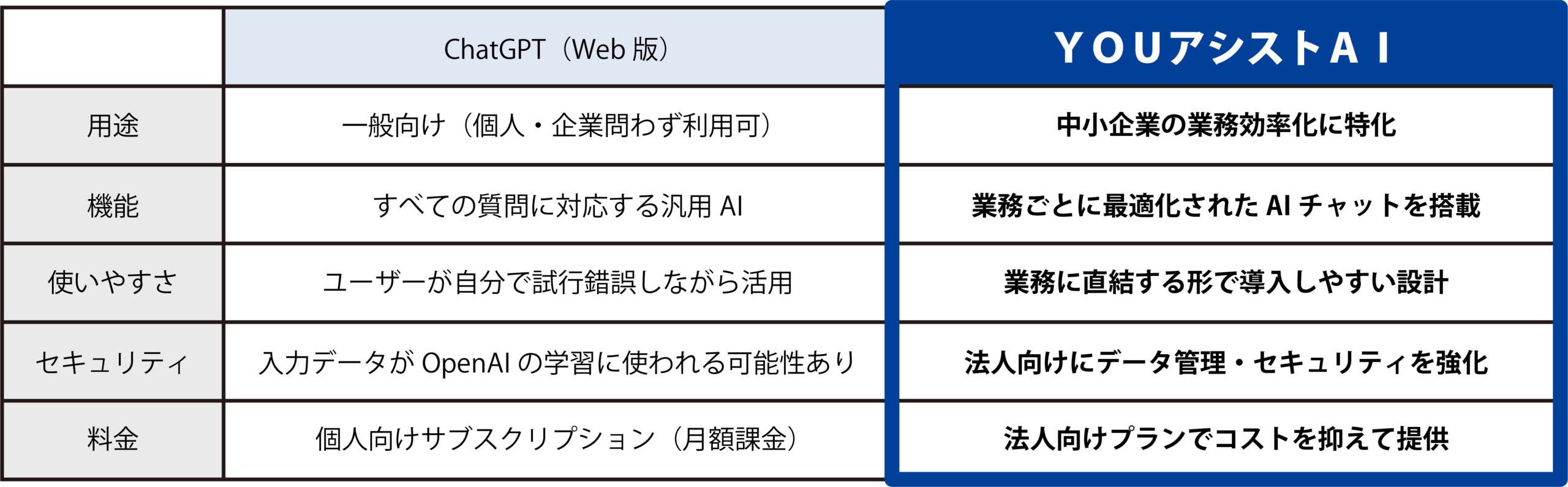 YOUアシストAI は、ChatGPTのLLM(大規模言語モデル)をAPI経由で利用しており、基本性能は共通しています。ただ、YOUアシストAIは中小企業の業務にフィットするように最適化した、法人向けのAIサービス です。